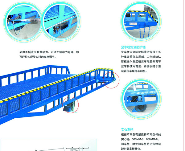 移動式登車橋是與叉車配合使用的貨物裝卸輔助設(shè)備,可根據(jù)貨車車廂的高低調(diào)節(jié)高度,叉車可以直接通過本設(shè)備駛?cè)胲噹麅?nèi)部進(jìn)行貨物的批量裝卸,僅需單人作業(yè),即可實現(xiàn)貨物的快速裝卸。它的菱形網(wǎng)狀結(jié)構(gòu),充分保證了卓越的防滑性能,使叉車有極好的爬坡性和可操縱性。即使在雨、雪天氣,仍能保證正常使用。它的可調(diào)節(jié)長度的索鏈能方便地鉤住貨車,使登車橋與貨車始終緊密貼合。采用手搖液壓泵作動力,不需外接動力電源即可輕松實現(xiàn)登車橋的高度調(diào)節(jié)。配置的剎車墊可有效防止貨車裝卸時登車橋移位。